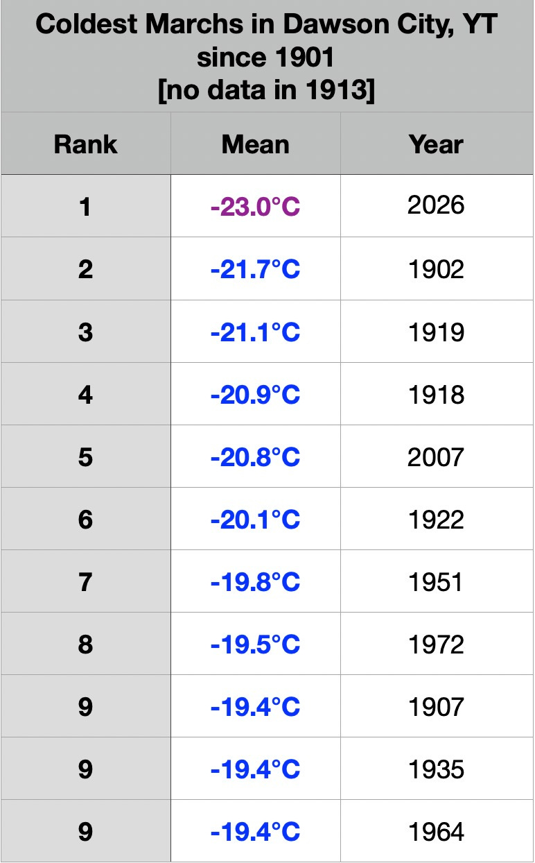 Outre Rankin Inlet (Nuvain), Churchill (Manitoba ) et Wabush (Terre-Neuve-et-Labrador), mentionnées hier, Dawson (Yukon) a également enregistré son mois de mars le plus froid jamais mesuré (données remontant à 1901).