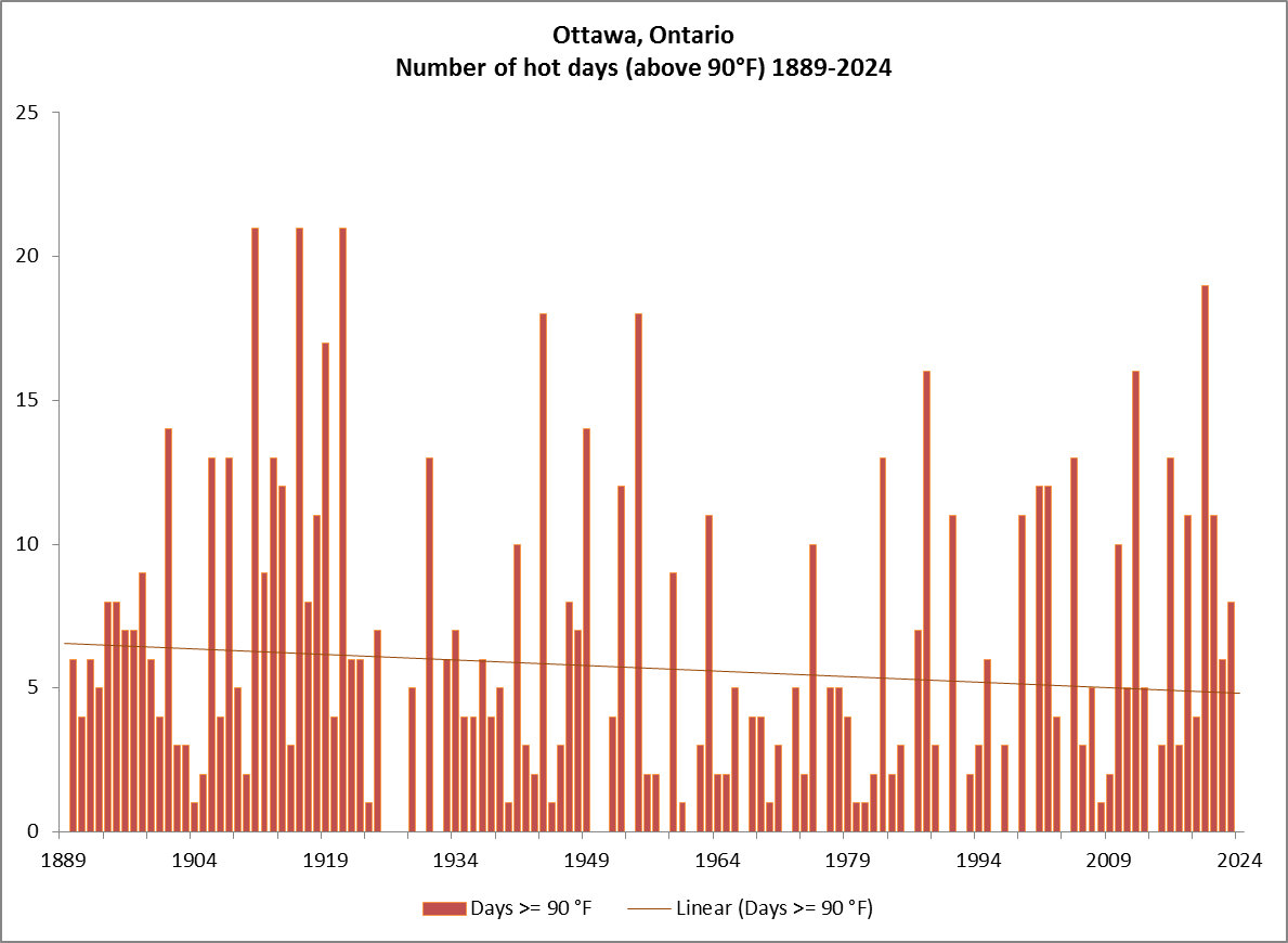 Les données historiques d’ Ottawa montrent une baisse à long terme des journées chaudes :