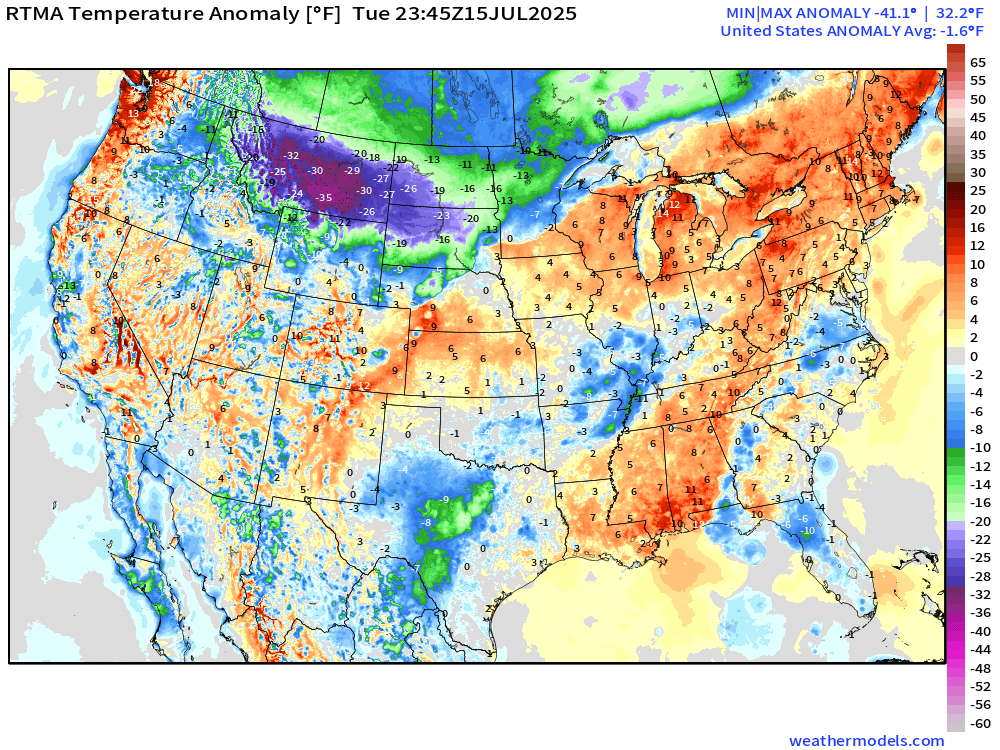 Depuis le 16 juillet, les États-Unis connaissent une anomalie de température nationale de -2°C, selon la RTMA.