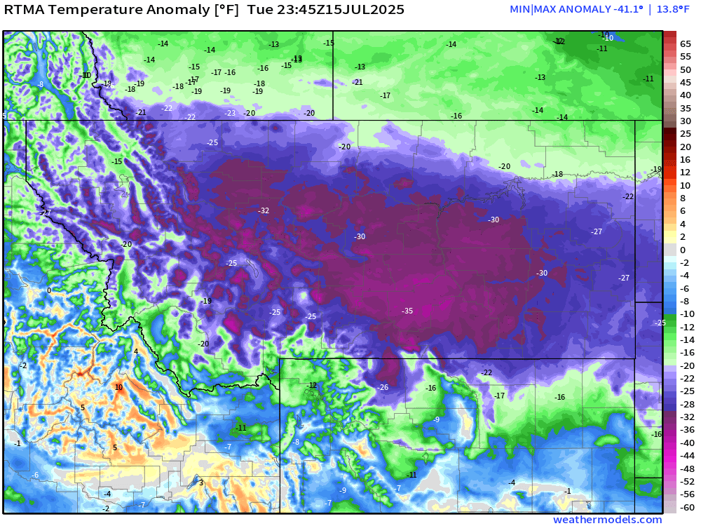 Une masse d'air arctique inhabituelle s'empare actuellement des Rocheuses du Nord, faisant chuter les températures dans le Montana , le Wyoming et les Dakotas de l'Ouest à des niveaux plus typiques du milieu de l'hiver que de la mi-juillet.