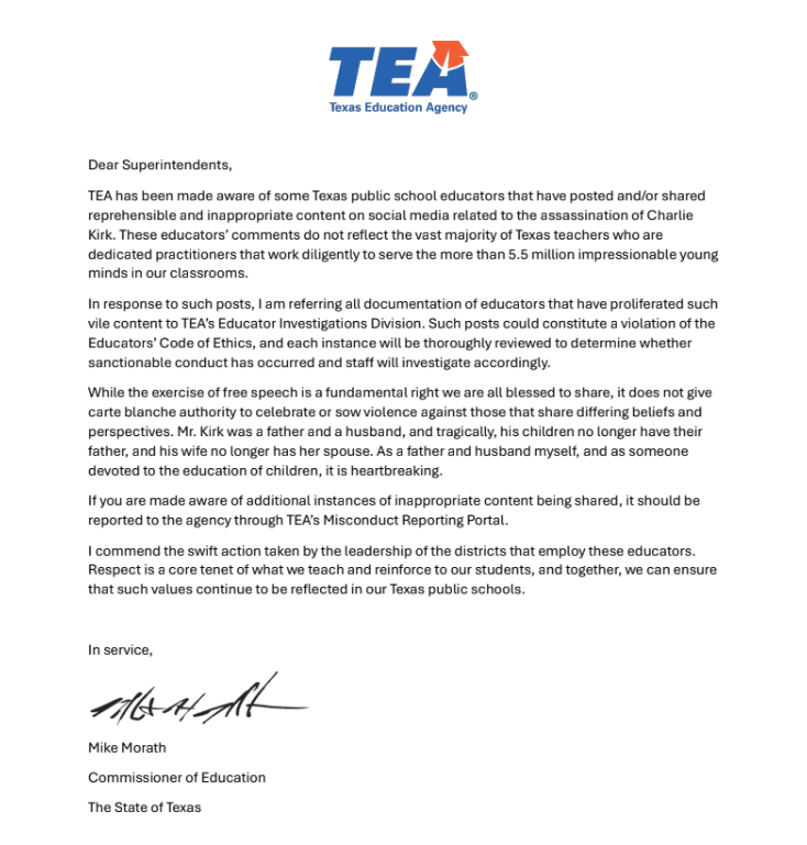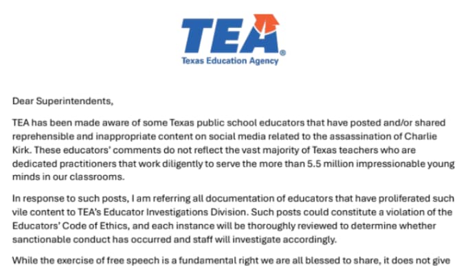 La TEA a déjà reçu plus de 180 rapports détaillés d'enseignants promouvant, partageant ou soutenant des contenus violents sur la mort de Kirk.