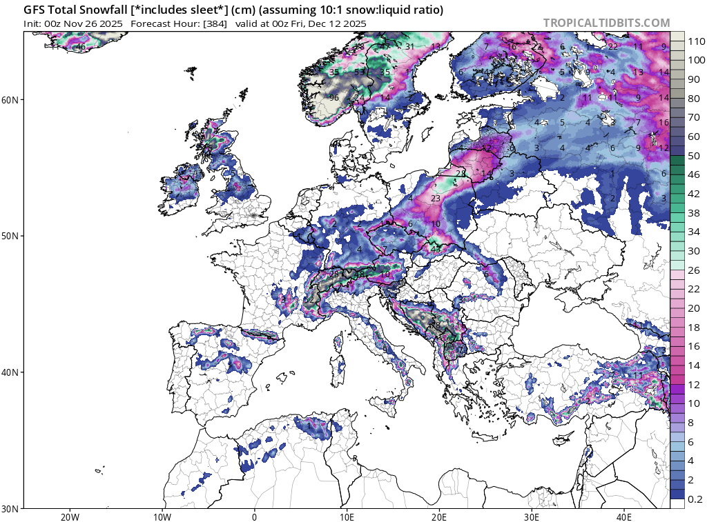 Chutes de neige totales selon GFS (cm) du 26 novembre au 12 décembre [ tropicaltidbits.com ]