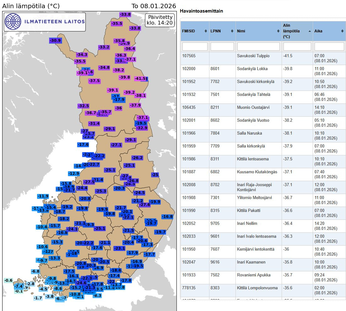 Le 8 janvier, Savukoski Tulppio a chuté à -41,5°C, la température la plus basse enregistrée jusqu'à présent cette saison dans toute la Fennoscandie (une région géographique couvrant la Norvège, la Suède, la Finlande et la péninsule de Kola du nord-ouest de la Russie).