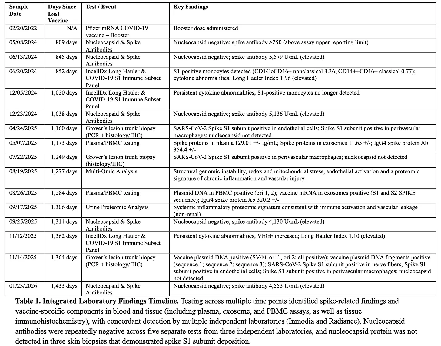L’étude qui en résulte, intitulée "Persistance sans précédent de l’ARNm vaccinal, de l’ADN plasmidique, de la protéine Spike et dérégulation génomique plus de 3,5 ans après la vaccination contre la COVID-19 par ARNm", présente, à notre connaissance, le rapport de cas le plus complet à ce jour sur les effets indésirables liés au vaccin contre la COVID-19.