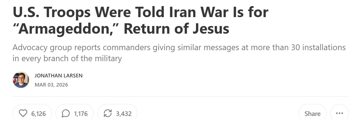Le département de la Guerre américain (Pentagone) réactive aujourd'hui les justifications religieuses en affirmant aux troupes et aux civils que la guerre contre l'Iran accélère l'apocalypse et le second avènement de Jésus – instrumentalisant une fois de plus la religion pour justifier la mort de milliers (voire beaucoup plus) d'innocents. Ceci marque le début d'une nouvelle ère de croisades au Moyen-Orient.