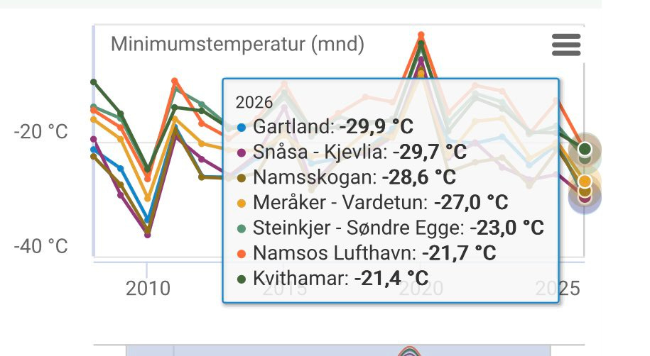 Plusieurs stations ont approché les -30°C, notamment Gartland à -29,9°C, Snasa-Kjevlia à -29,7°C, Namsskogan à -28,6°C et Meraker-Vardetun à -27°C — toutes des valeurs sévères pour le centre de la Norvège.